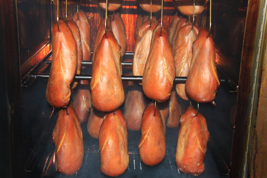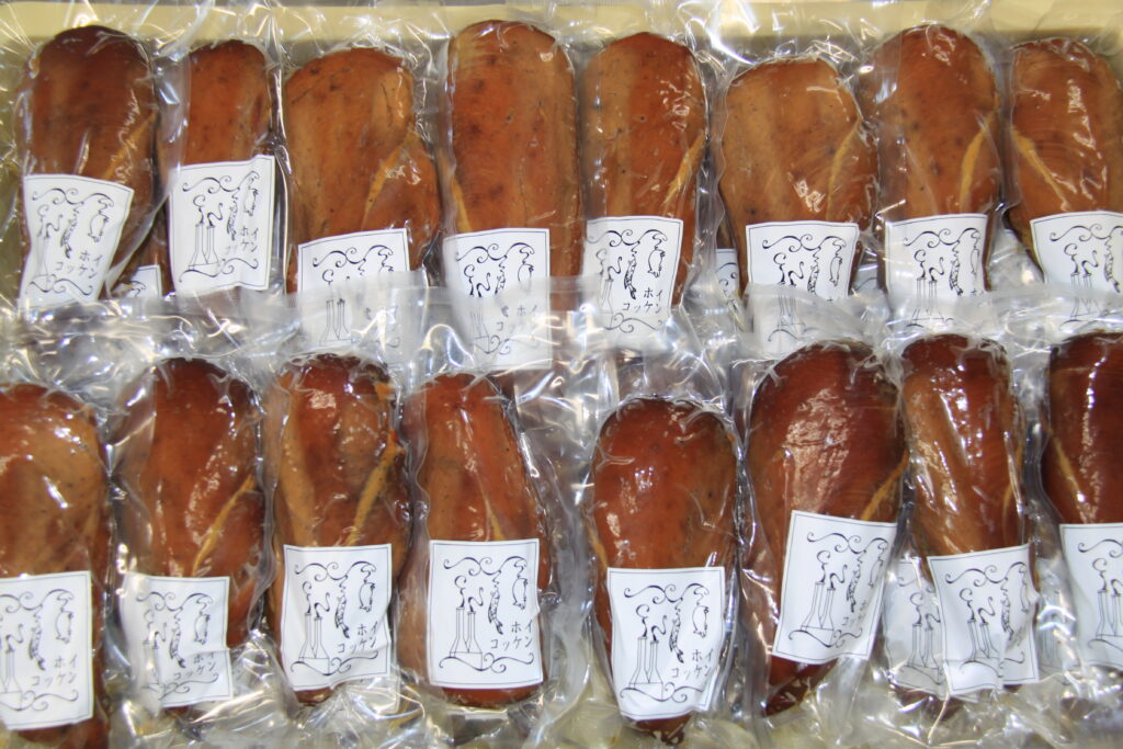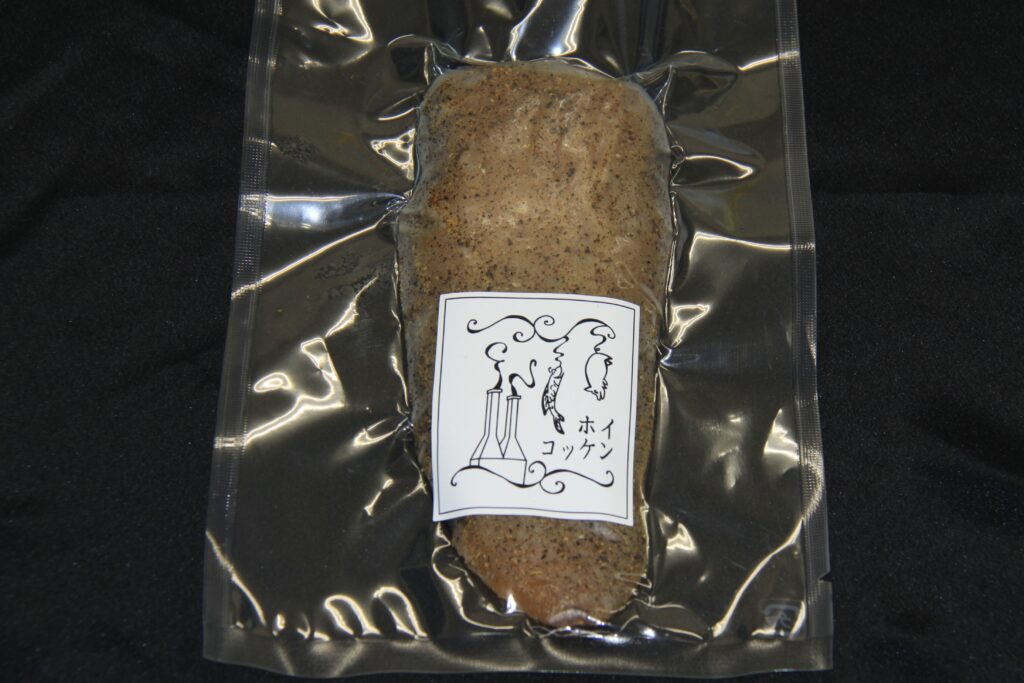 鶏の胸肉を使ってベーコンにしています。鶏肉の旨味が引きだせるよう、各種スパイスを独自に調合し長期間マリネしました。その後冷蔵庫で一旦熟成させ、温燻にしています。柔らかく、口に入れるとほのかな燻製の香りが鼻に抜けていきます。お好みの厚さに切ってそのままお召し上がりください。お酒のおつまみだけでなく、サラダやご飯にもよく合います。